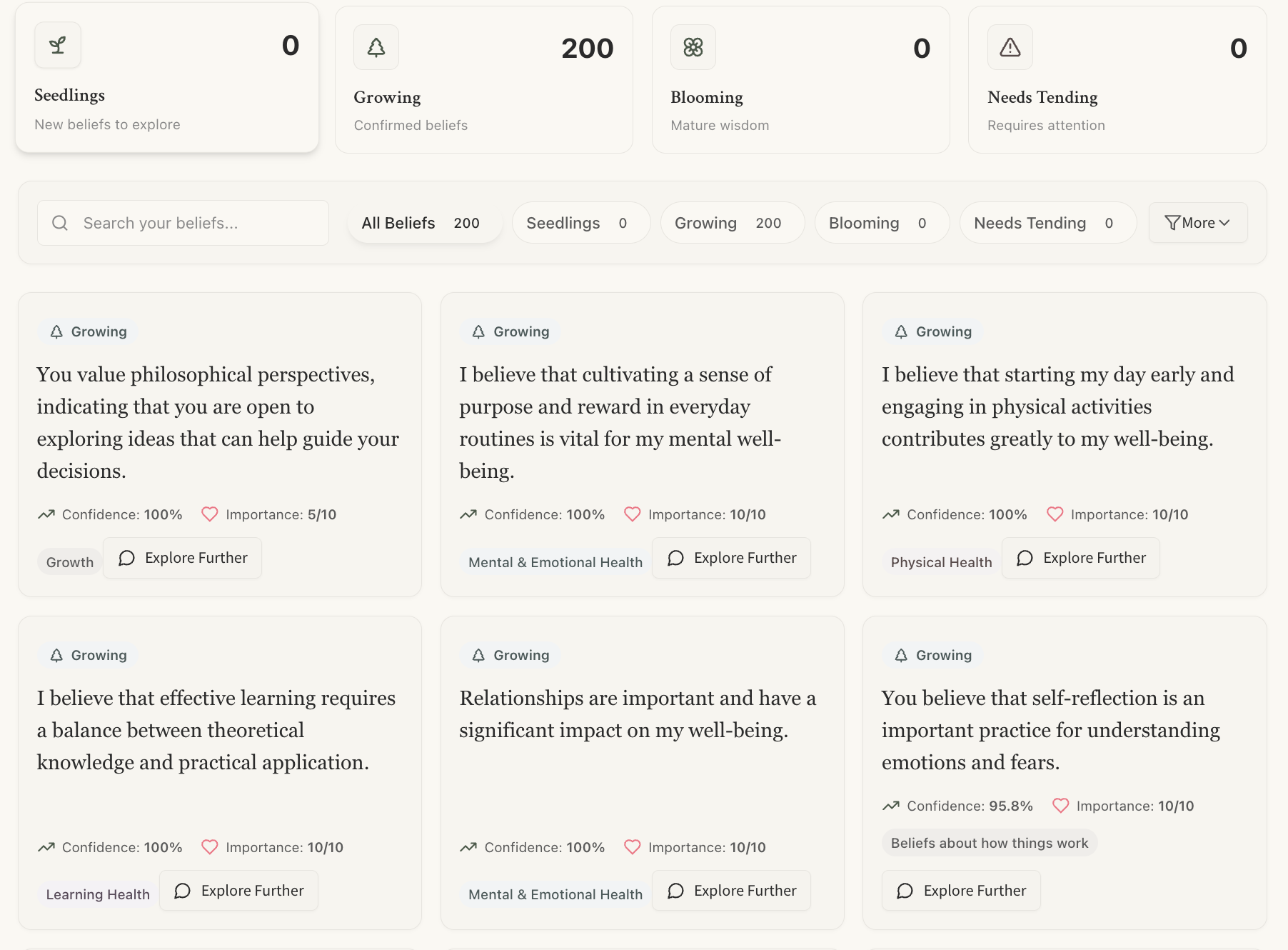 - Belief Garden: My beliefs are tracked like plants—seedlings, rooted truths, ideas that need tending.