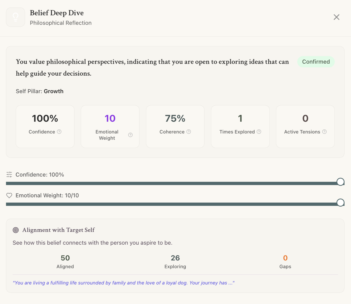 And here’s a deep dive into a belief, where I can see how aligned this belief is to my Target Self, and explore any tensions the system detects with the belief from my interactions.
