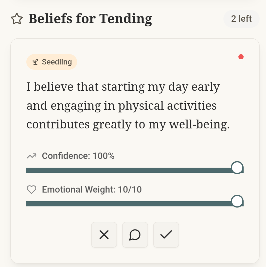 I started with a UX where I can tend to my Belief Garden daily—beliefs that start as seedling beliefs that are detected from conversations with Clarity.