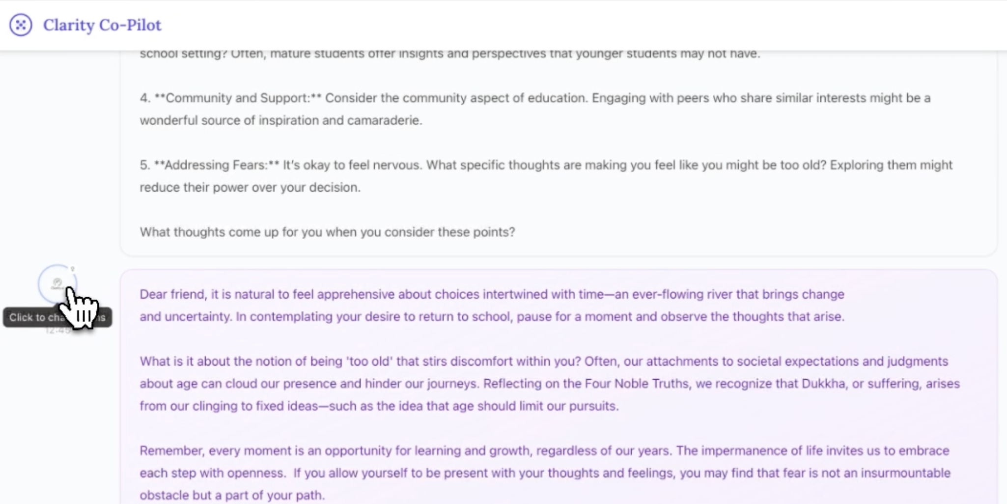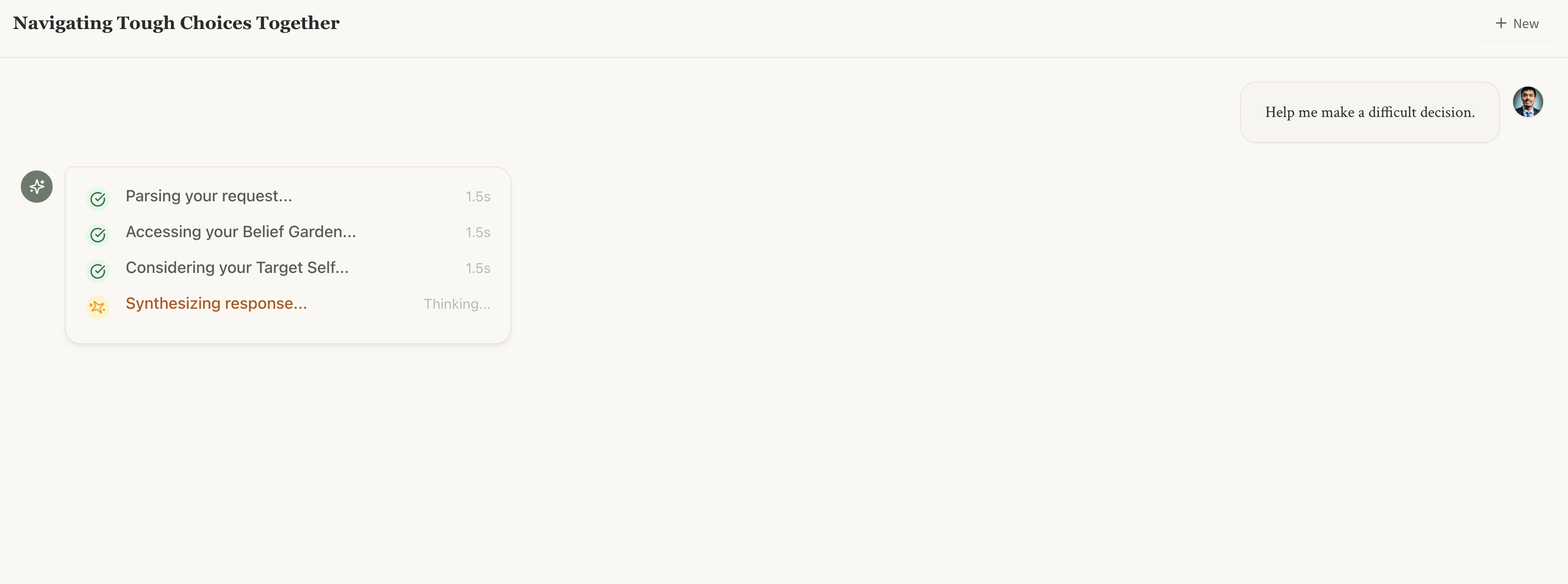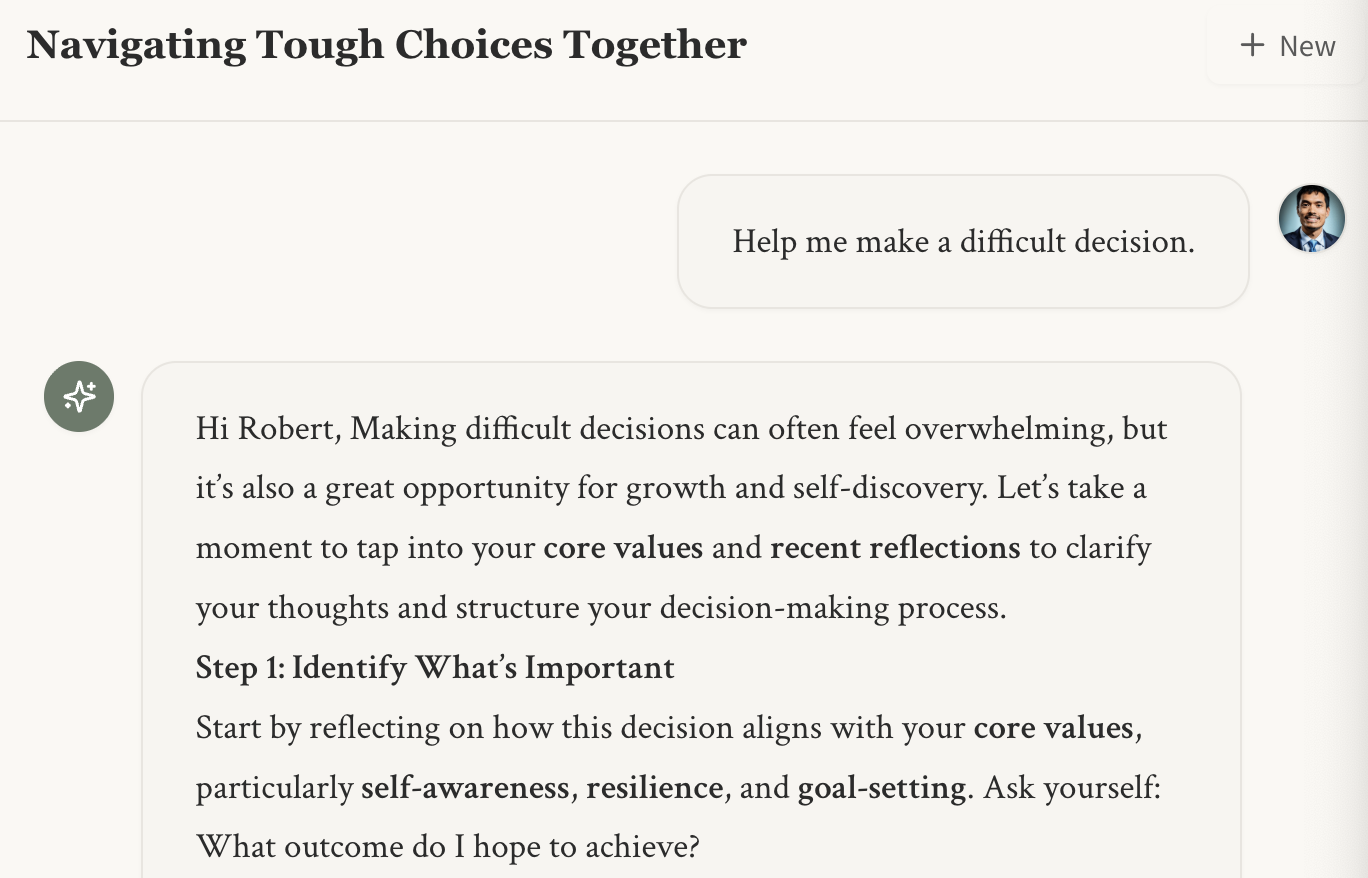 At this point, I was properly dogfooding as I was trying to use this to as a decision support for navigating some tough family choices. I had to thoughtfully reflect on what was helpful/not in real time.