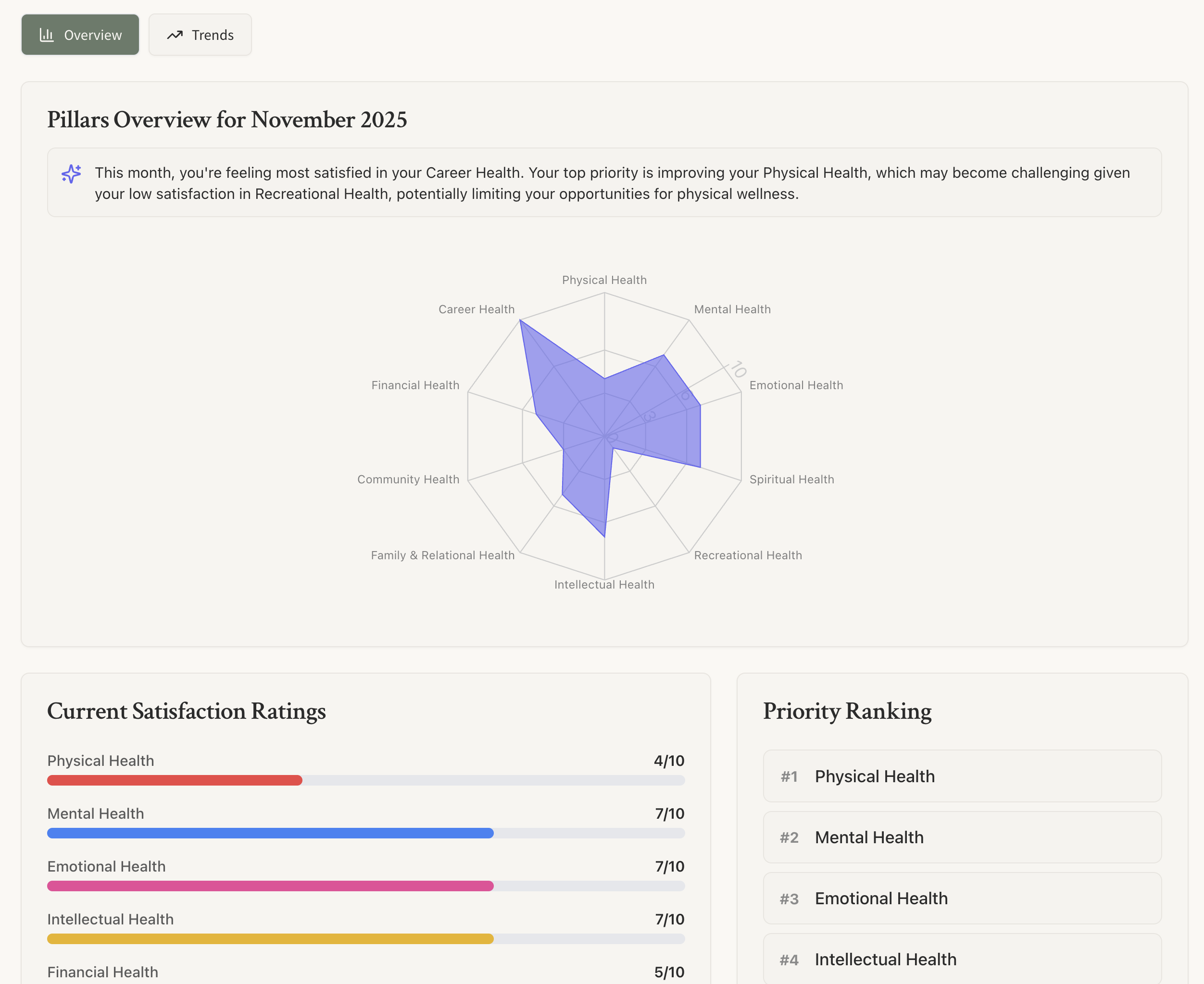 I added a Monthly Life Pillars Assessment feature.