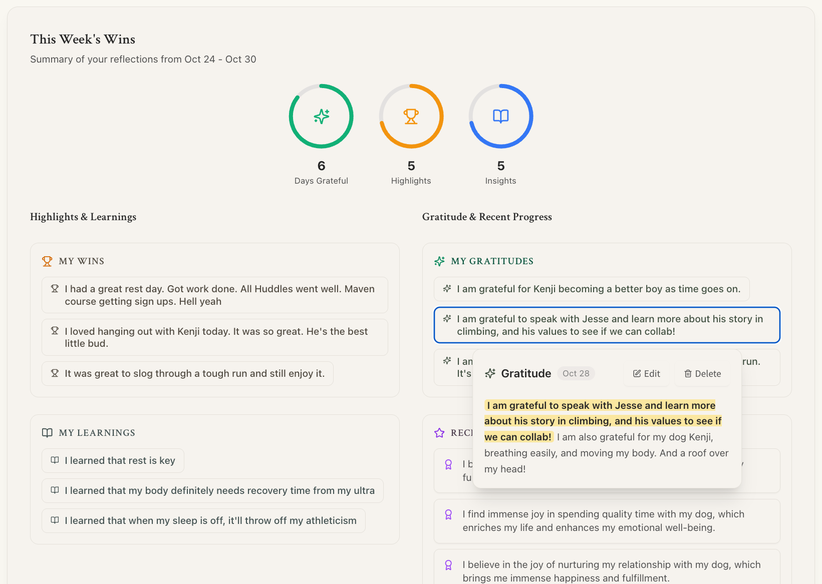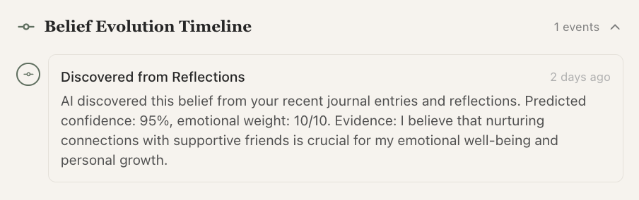 And I decided I’ll solve my own problems: fragmented journaling I don’t go back to, static personality tests not correlating with dynamic life, not being able to fully trust ChatGPT or Claude to support my decision making because they don’t consider who I want to become.